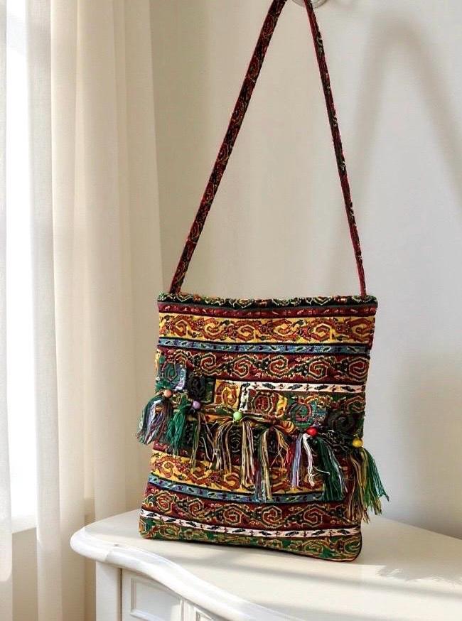 Celebrate timeless Anatolian artistry with this handmade messenger saddlebag, designed with antique rug–inspired patterns, colorful tassels, and ethnic bead details. A soulful piece that blends free-spirited gypsy vibes with elegant bohemian charm, making it the perfect accessory for everyday wear.