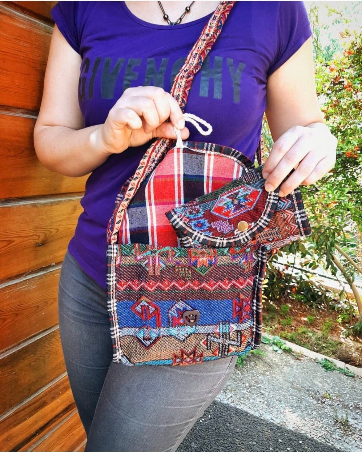 This unique carpet pattern fabric handmade bag and wallet set, all handcrafted in our local workshop in Turkey, is the perfect fall and winter accessory to add color to your day, as well as a great opportunity to make happy your loved ones with a personalized product. This unique set consists of an adjustable strap rug bag with an inside zippered pocket and a wallet with 3 compartments, one of which is zippered.