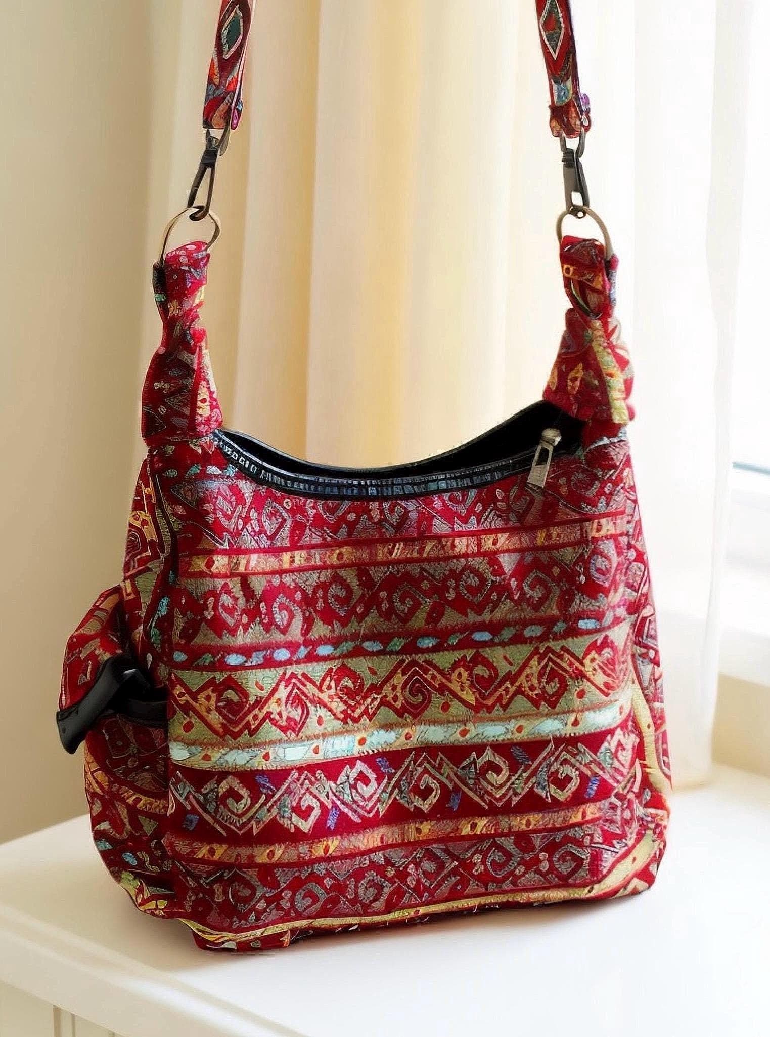 Add a bold and vibrant touch to your style with this handmade red messenger bag, crafted from durable ethnic pattern fabric in our local workshop. Designed for everyday practicality, it features two spacious compartments and one small pocket, offering both style and function.