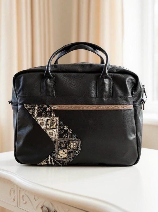 Upgrade your work style with this Handmade Black Leather Laptop Briefcase satchel, detailed with rug-patterned fabric for a sophisticated artisanal touch. Designed for both functionality and elegance, this durable briefcase offers 8 organizer pockets, making it perfect for carrying your laptop, business cards, fountain pens, documents, and daily essentials together.