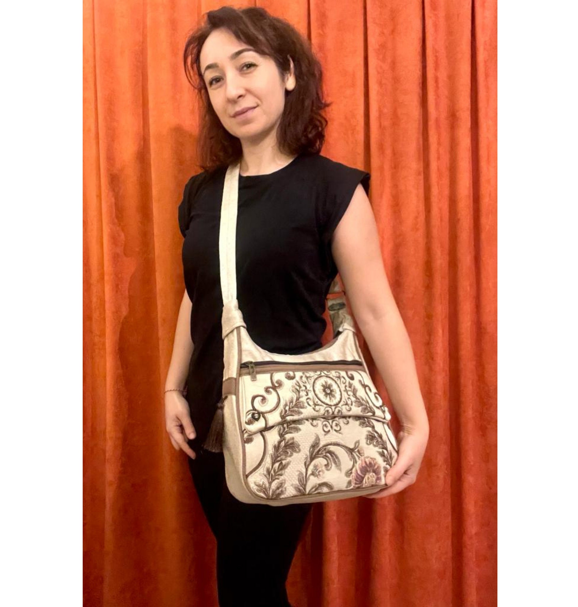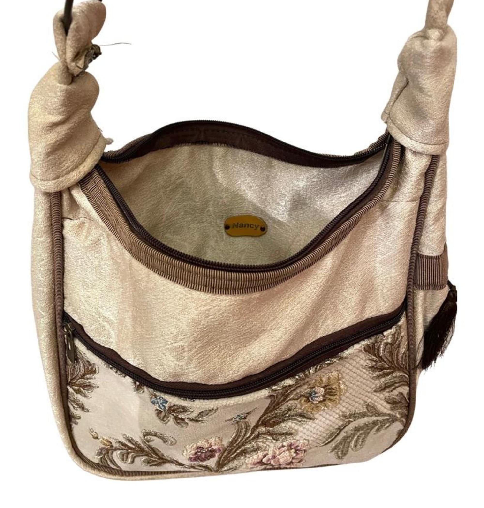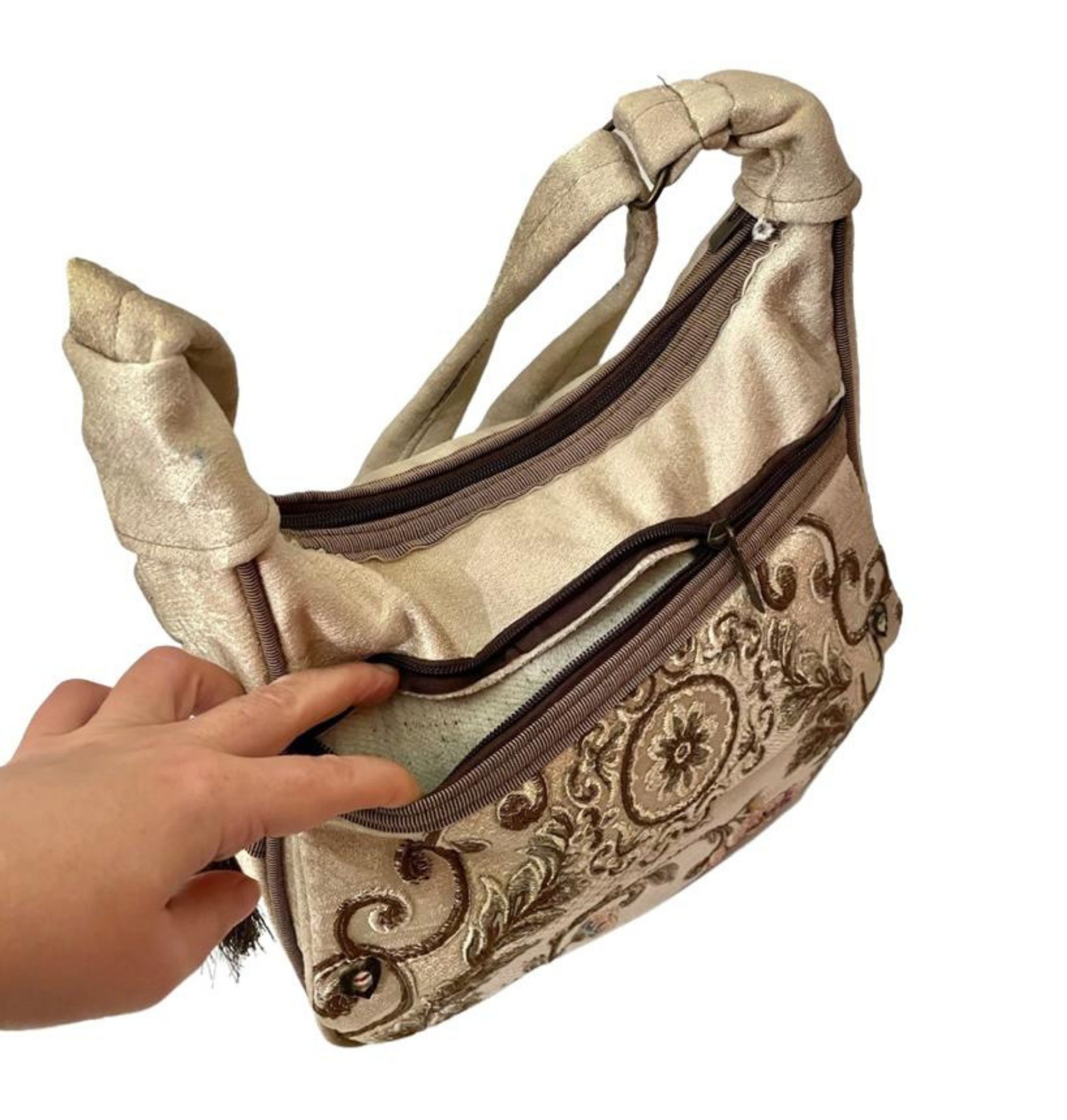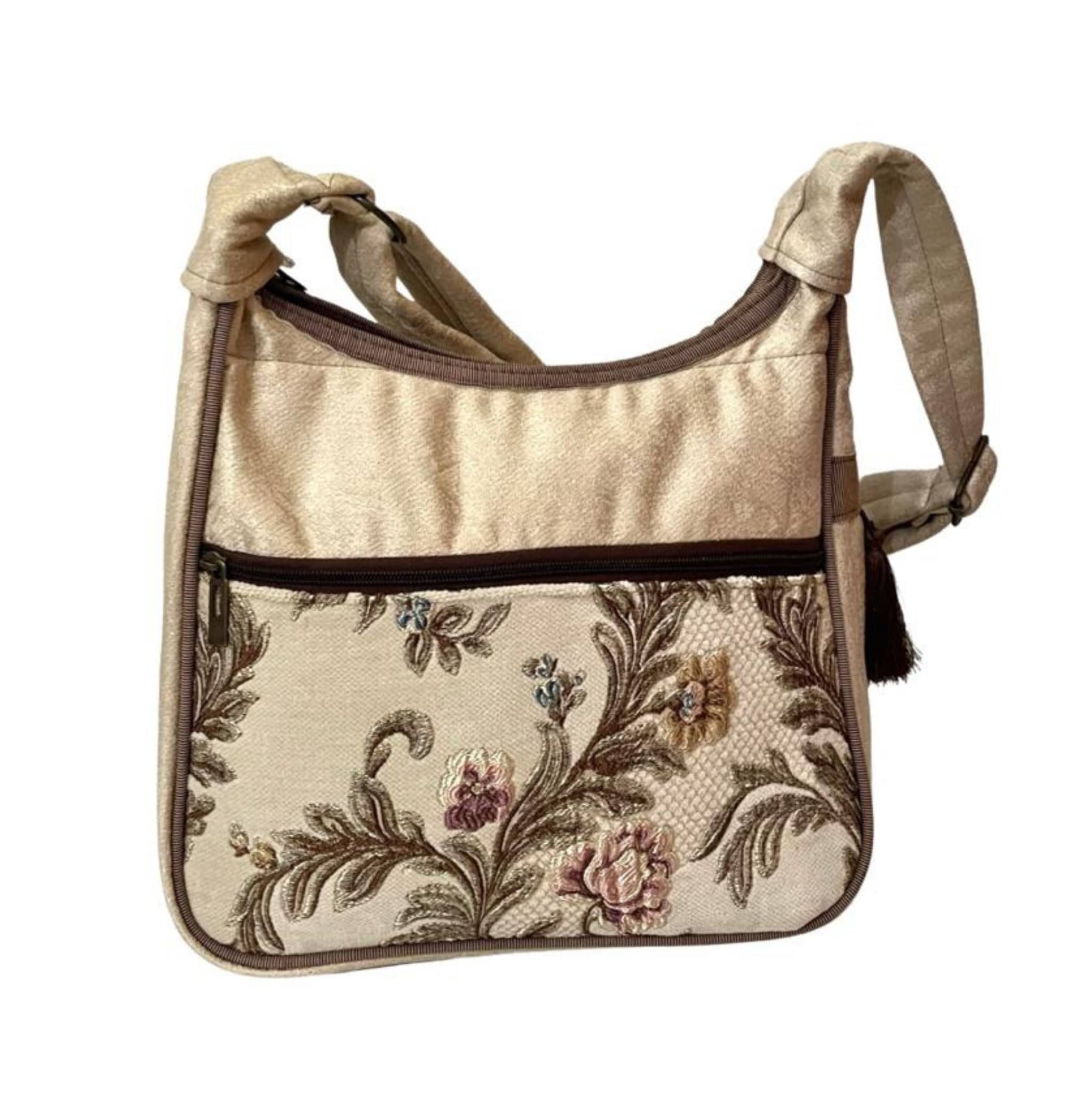 Add elegance to your style both day and night with this unique Victorian floral shoulder bag made of ivory satin fabric. It has two zippered compartments. The interior is lined with a rose-patterned lining. Shoulder strap is adjustable. The front and back have separate patterns. If you want, you can personalize this lovely purse by adding a name tag and turn it into a meaningful birthday gift for your wife, sister, mother, best friend. It is also a perfect gift for Christmas, new year and anniversary. You can ask us to gift wrap and put card inside.