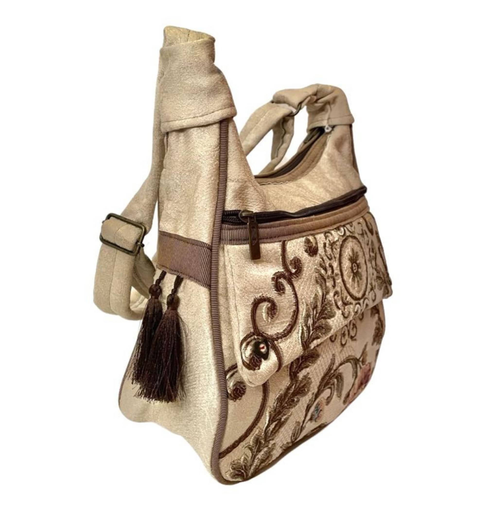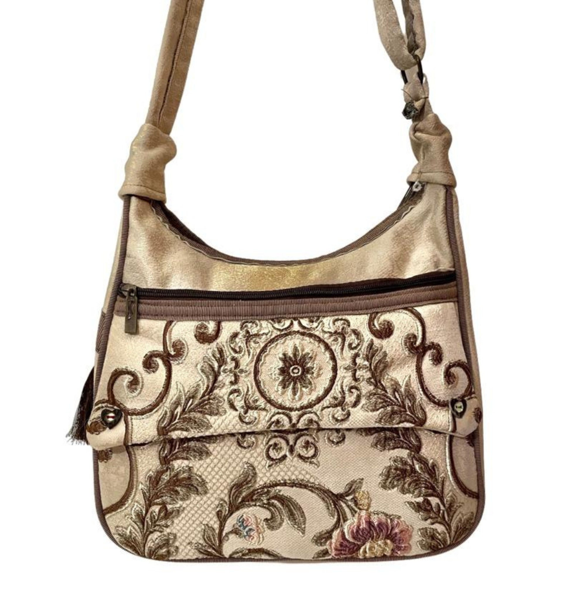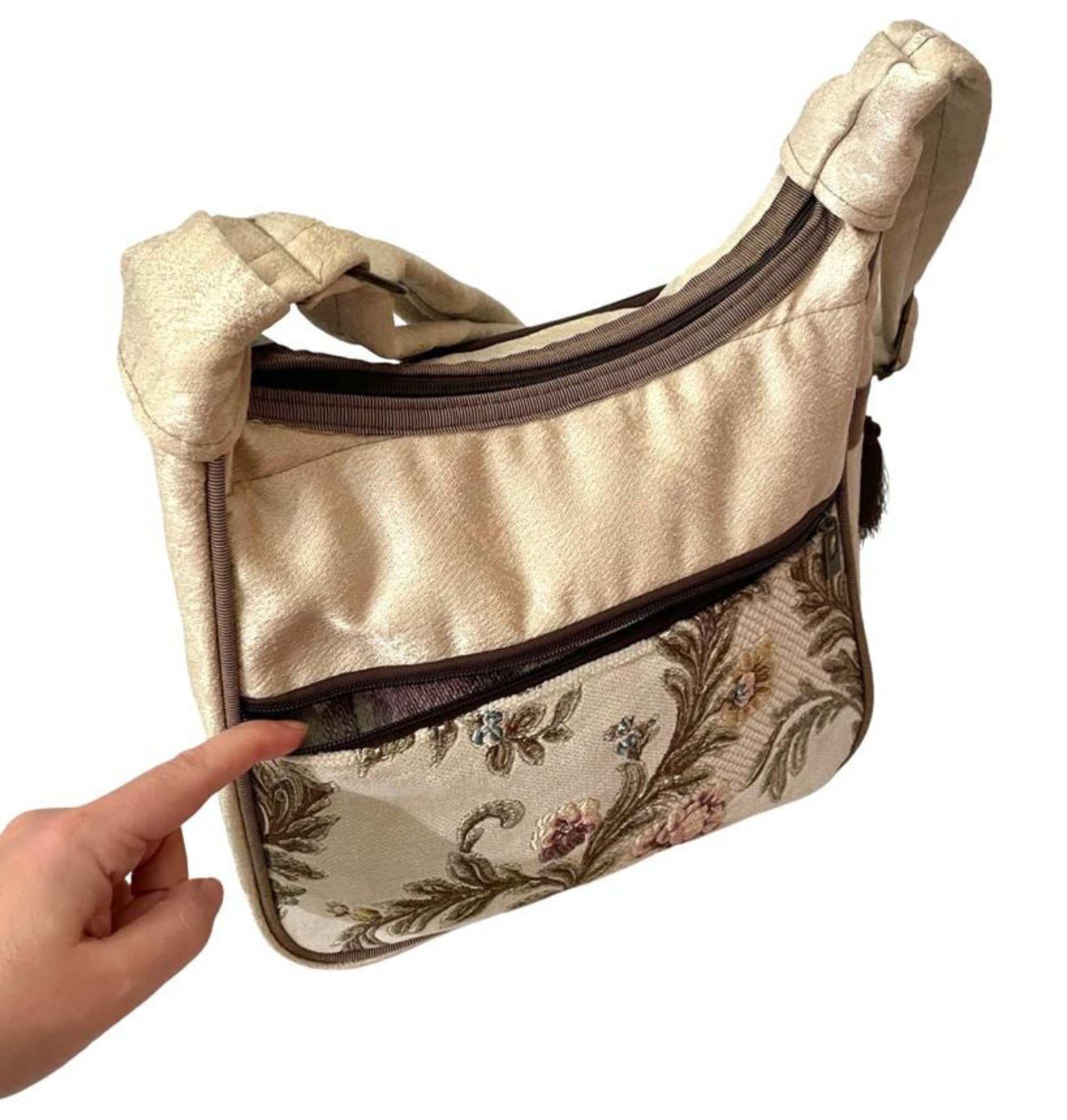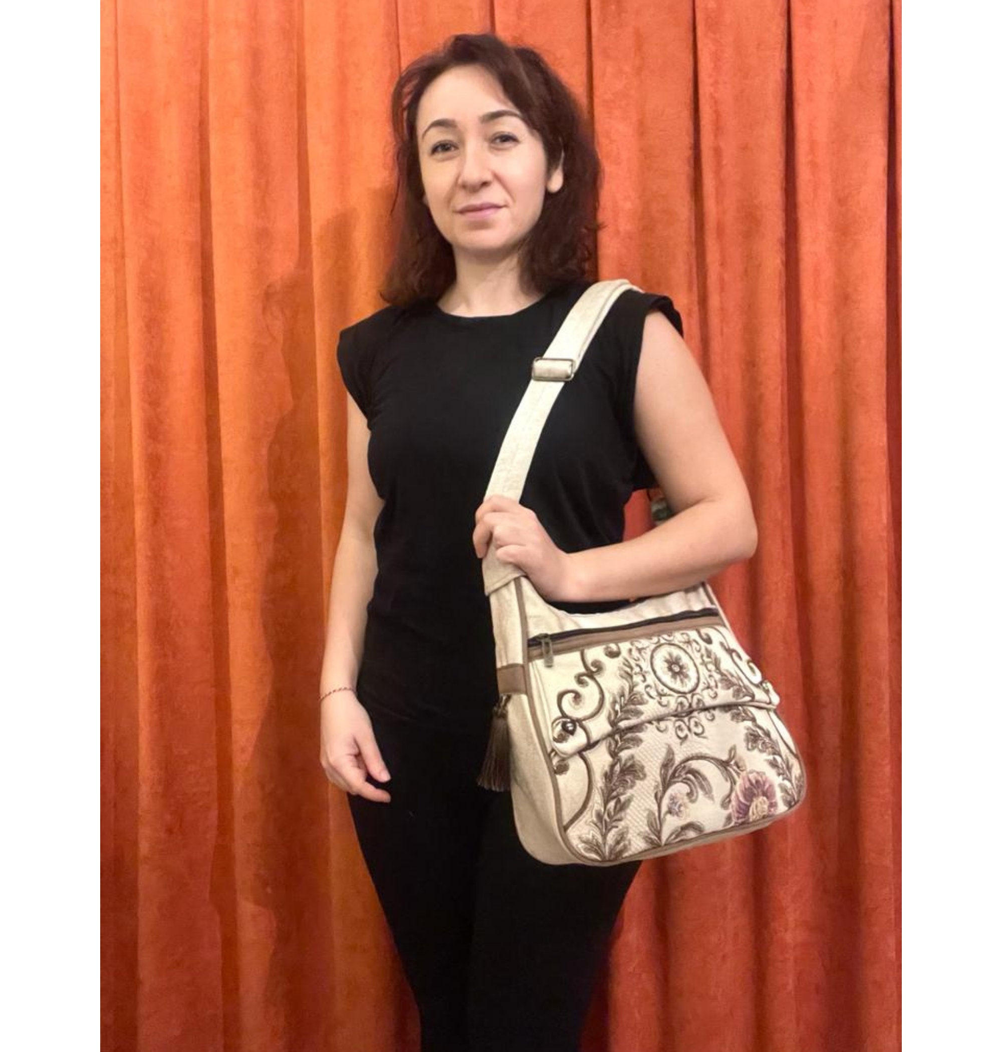 Add elegance to your style both day and night with this unique Victorian floral shoulder bag made of ivory satin fabric. It has two zippered compartments. The interior is lined with a rose-patterned lining. Shoulder strap is adjustable. The front and back have separate patterns. If you want, you can personalize this lovely purse by adding a name tag and turn it into a meaningful birthday gift for your wife, sister, mother, best friend. It is also a perfect gift for Christmas, new year and anniversary. You can ask us to gift wrap and put card inside.