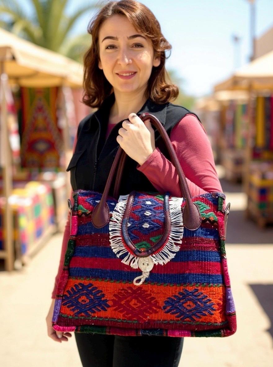 Handmade Bohemian Tote Bag – Wool Kilim with Tassels & Genuine Leather Handles