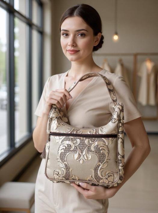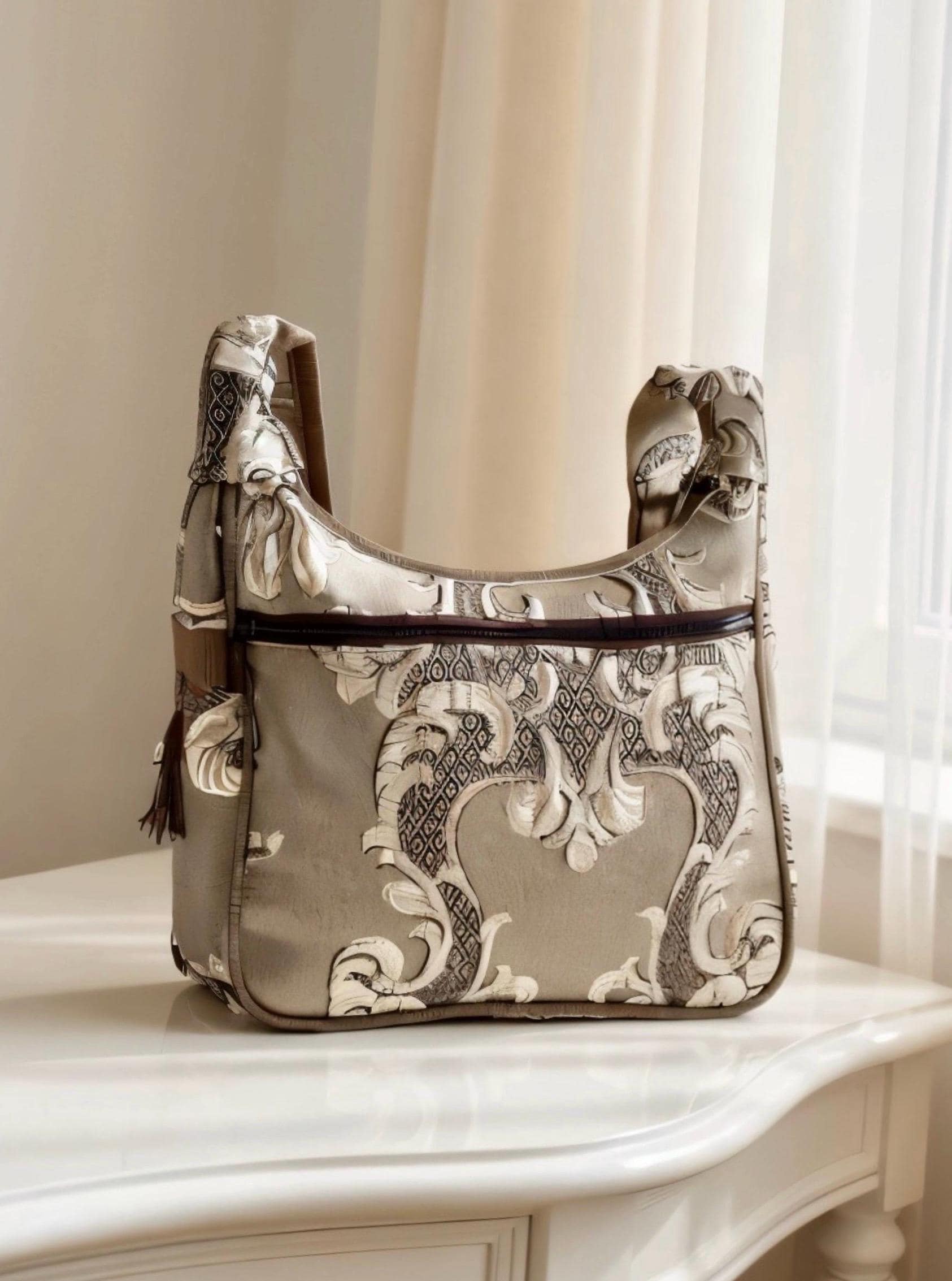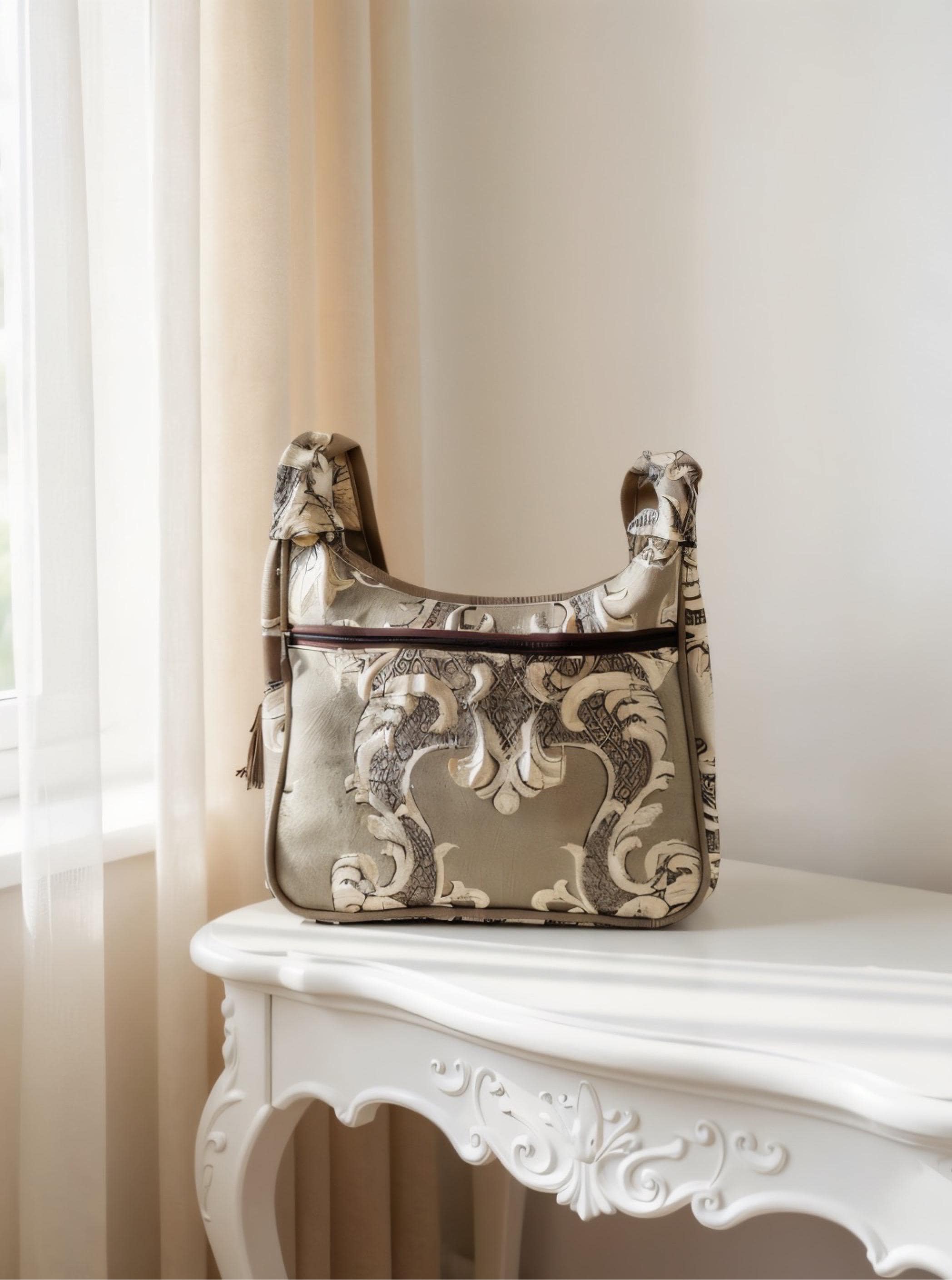 Step into timeless elegance with this Victorian-inspired cottagecore purse. Crafted from lightweight yet sturdy fabric, it is perfect for summer outings and folds easily for convenient storage. The shiny beige satin fabric, accented with a delicate tassel, makes it a stylish and eye-catching accessory. Each bag features a unique pattern, ensuring no two are ever the same.