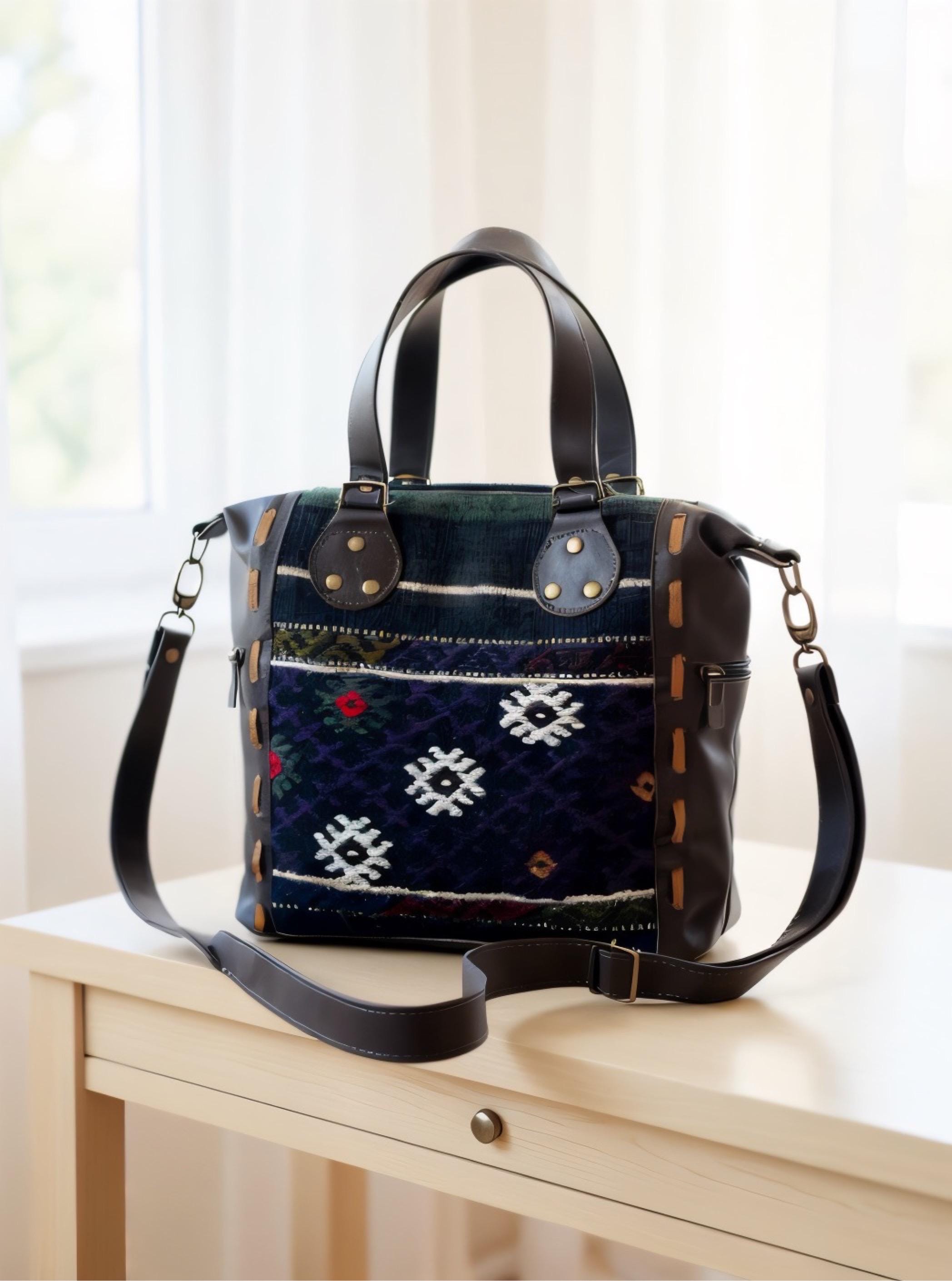 Make a bold statement with this stunning Navajo-inspired handwoven kilim bag, crafted from black wool kilim colored with natural, plant-based dyes. The genuine leather accents on the sides add strength and elegance, blending traditional artistry with modern functionality.