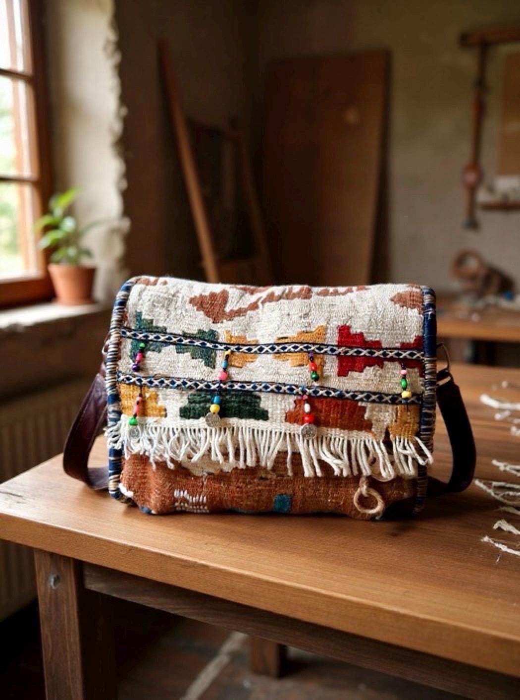 Handmade Purse from Antique Rugs – Unique Boho Crossbody Bag with Leather Straps