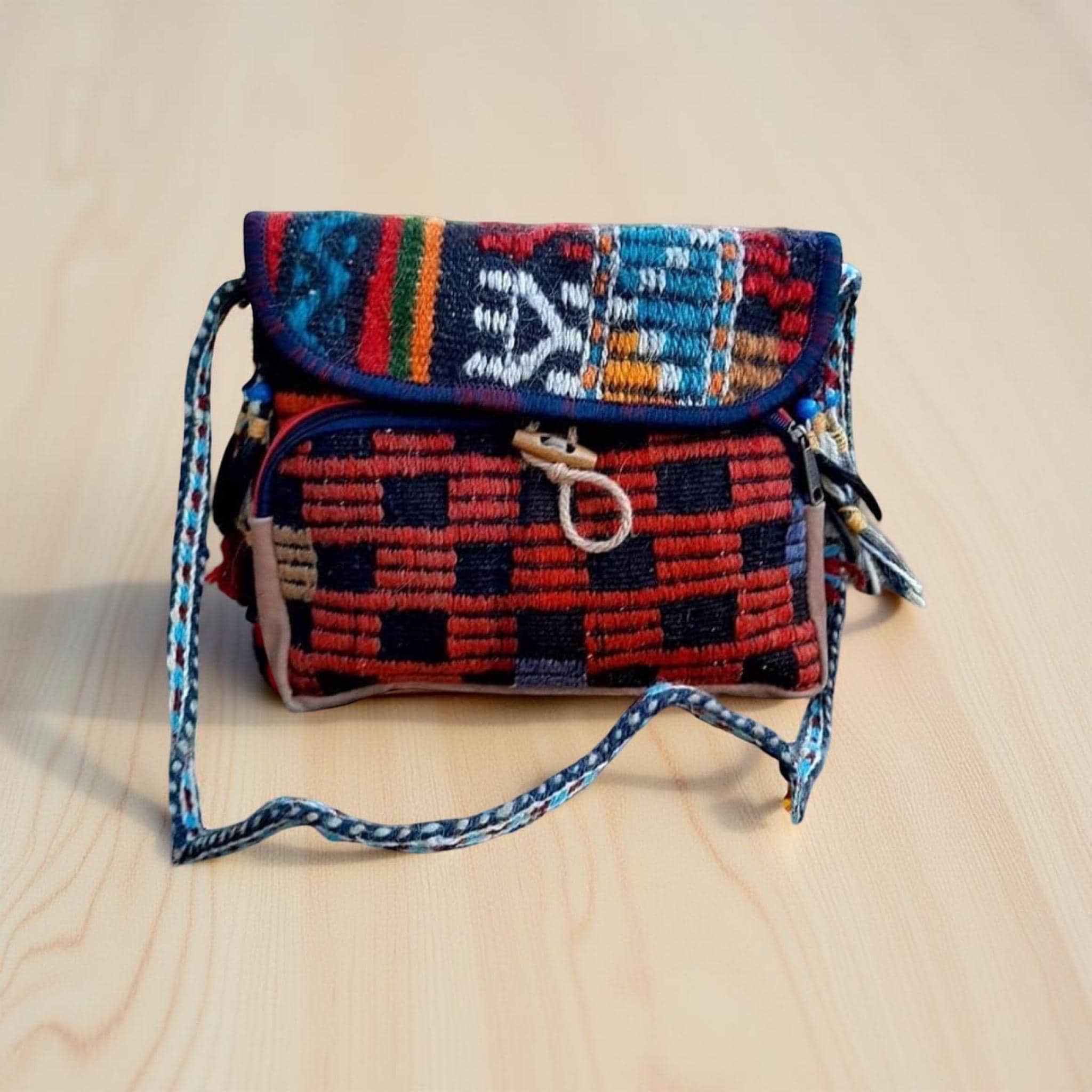 Embrace bohemian elegance with this Handmade Flip-Flap Kilim Bag, crafted from natural handwoven wool rugs and finished with charming beaded tassels on the sides. This one-of-a-kind artisan piece blends tradition with modern functionality, making it more than just a bag—it’s a wearable piece of culture.
