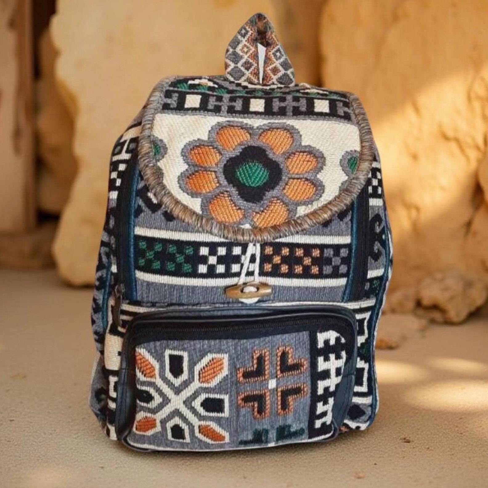 Carry culture and style with this Handmade Soft Grey Kilim Backpack, crafted from durable woven kilim fabric and decorated with traditional Anatolian motifs. The flower pattern is believed to bring wellness and positive energy—making this bag more than just an accessory.