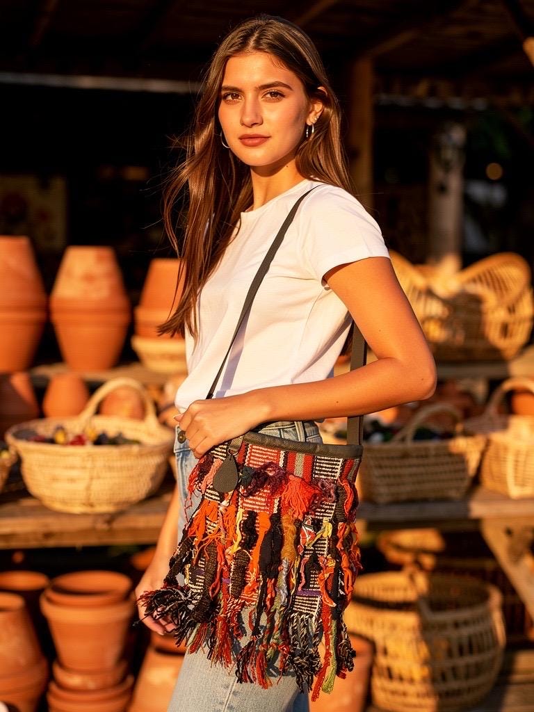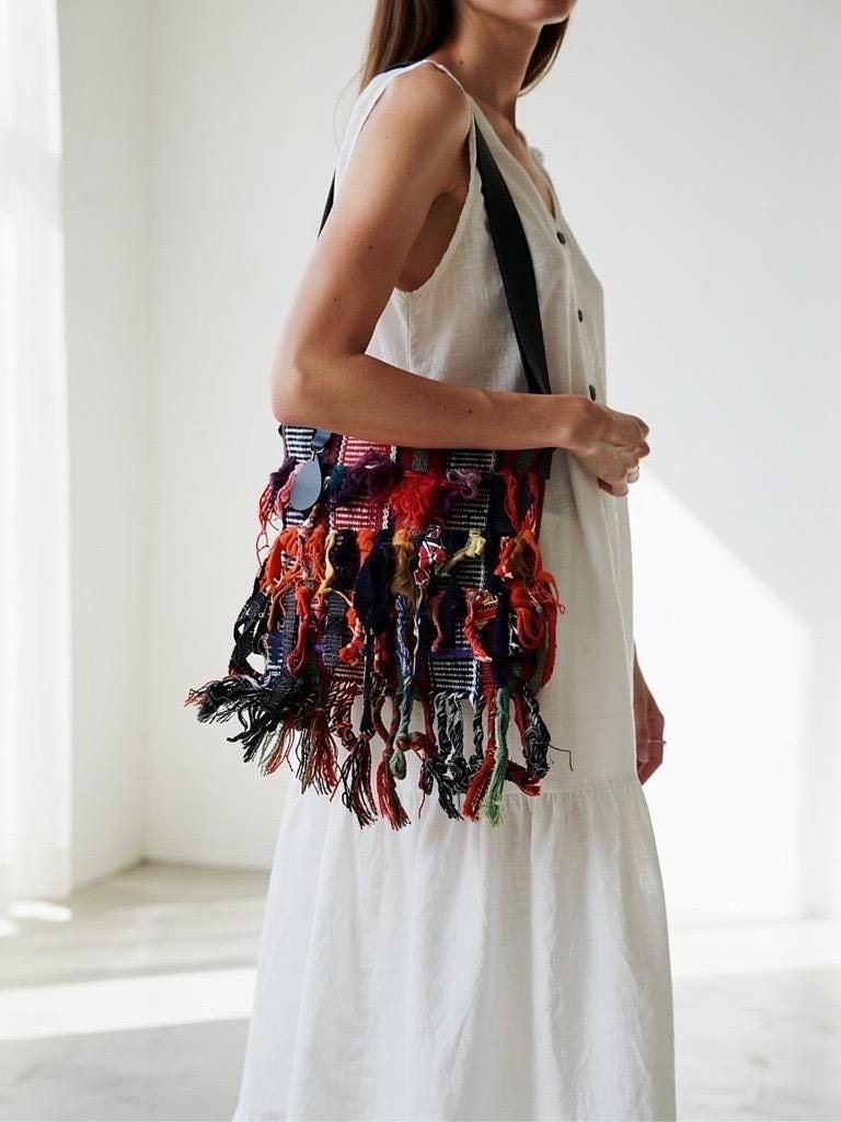 This Navajo-inspired bag is a stunning combination of genuine leather and authentic vintage rug/kilim/carpet fabric, accented with beautiful fringes that make it truly one-of-a-kind. Each piece is handcrafted in our local workshop with care, blending cultural heritage with timeless style.